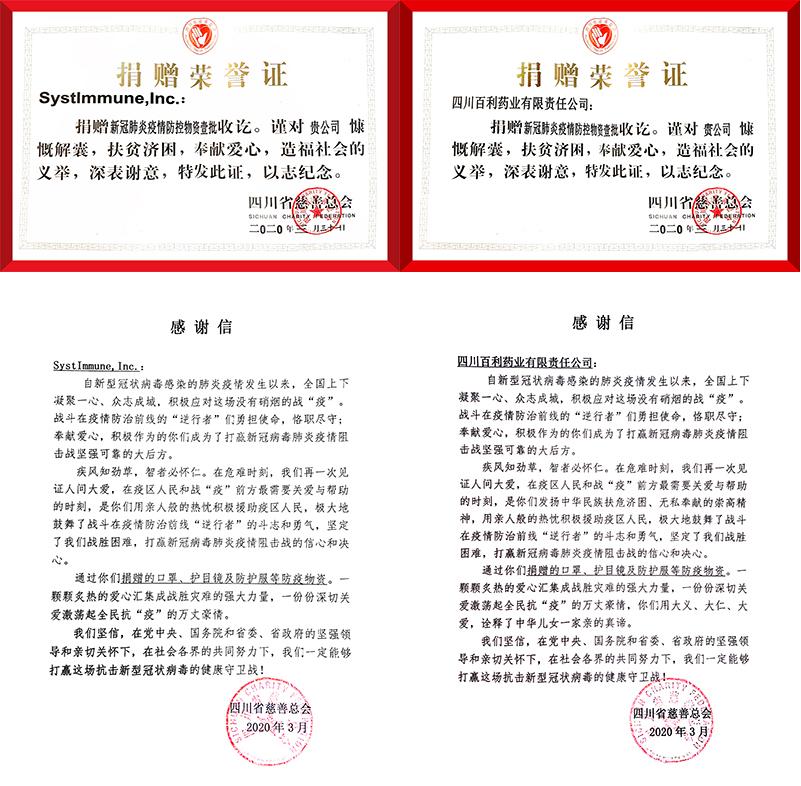 百利药业携手美国西雅图免疫,中美企业共同通过四川慈善总会,向四川和湖北等一线医院分批次捐赠医用外科口罩和N95口罩、护目镜、防护服等防护用品。向全国几十家医院捐赠抗病毒药物新博林(利巴韦林颗粒)和提高免疫的好好黄芪颗粒等,助力一线医护抗疫